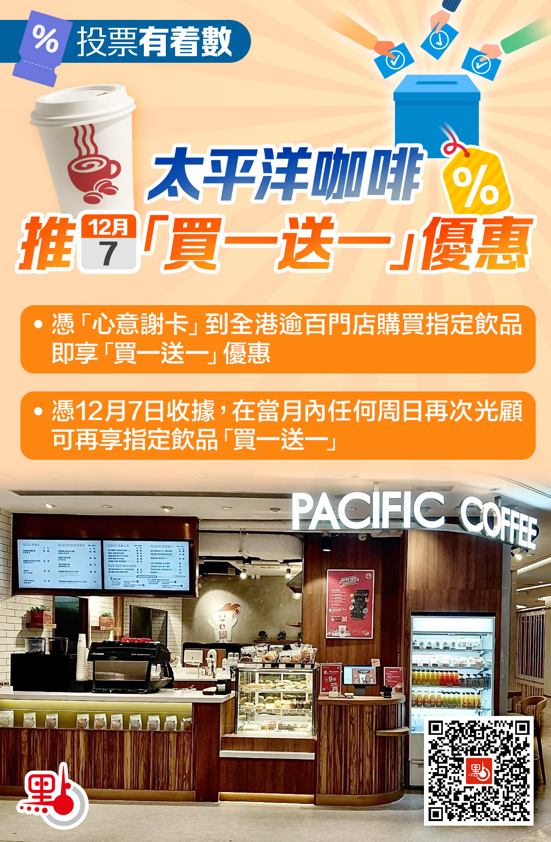 據悉,這一優惠將在太平洋咖啡全港約110間門店同時推出,12月7日當天,投票市民憑「心意謝卡」到任何門店購買指定飲品,即享買一送一優惠。憑當日收據,還可在當月內任何周日再次光顧,可再享指定飲品買一送一優惠。