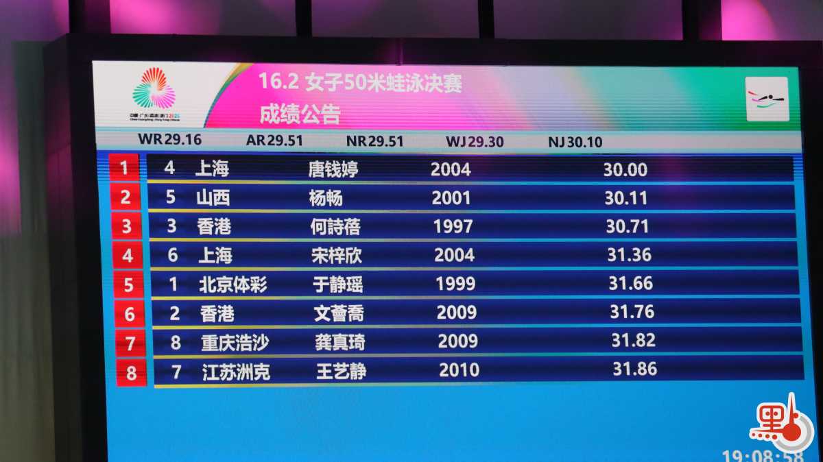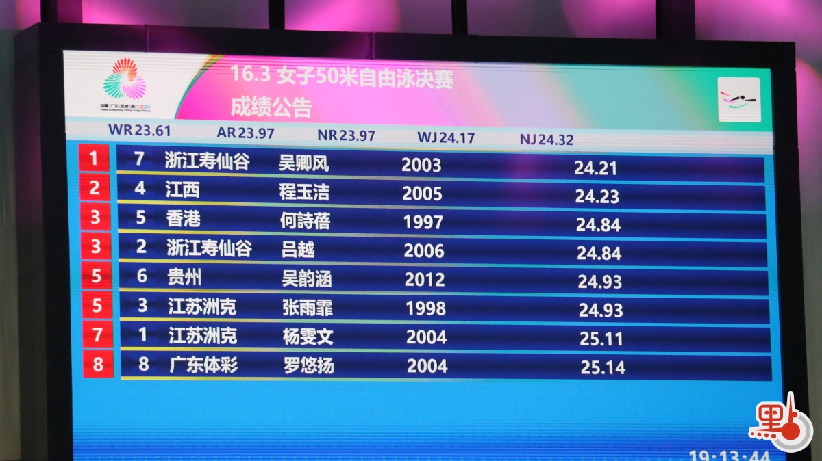 50米自由泳是萬眾期待的何詩蓓大戰張雨霏,何排第5線,張排第3線,江西隊的程玉潔排第4線。何詩蓓的體力未受影響,5分鐘內又奪得一面銅牌,她的時間為24.84秒,與呂越並列季軍,吳卿風和程玉潔分奪金銀,張雨霏排名第5。