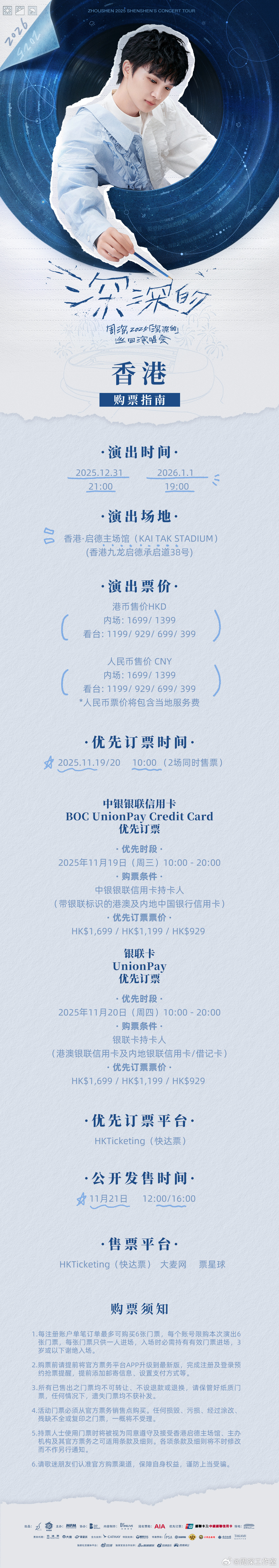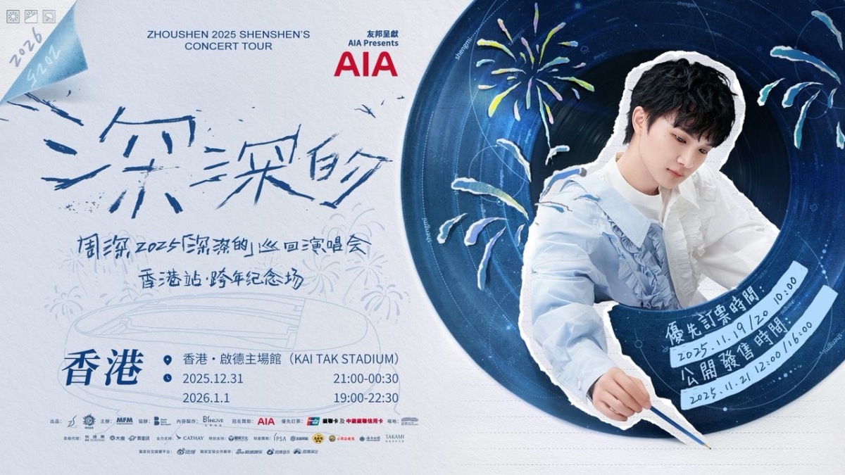 【點新聞報道】內地歌手周深將於2025年12月31日至2026年1月1日,在啟德主場館舉辦《AIA友邦呈獻周深2025「深深的」巡迴演唱會-香港站·跨年紀念場》,持有中銀銀聯信用卡的歌迷明起(19日)可享優先訂票!另外,銀聯卡優先訂票於11月20日開始,門票公開發售時間則為11月21日。今次演唱會票價共有HK$1699/$1399/$1199/$929/$699/$399六個價位,屆時均會在HK Ticketing快達票、大麥網及票星球開售。