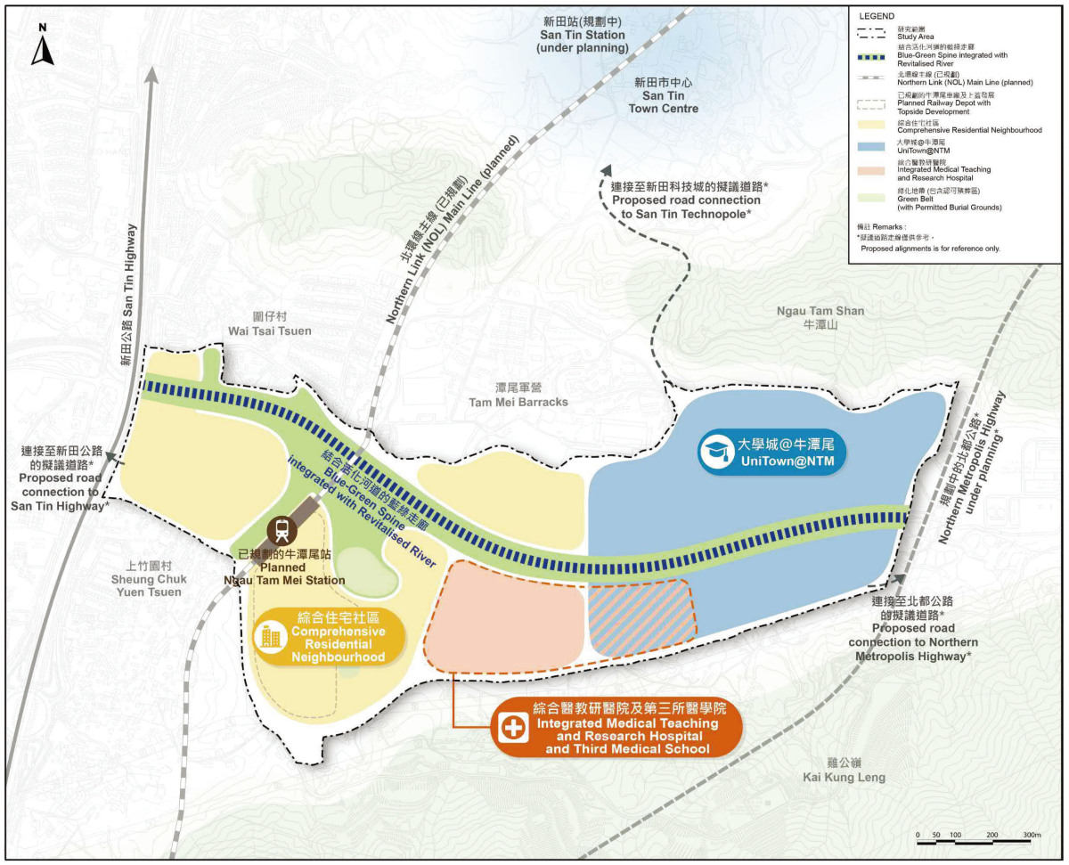 政府持續推出北部都會區發展細節,去年底布牛潭尾的初步規劃建議,總發展面積約127公頃,當中46公頃將發展大學城,包括本港第三間醫學院。牛潭尾位於北部都會區的創新科技地帶範圍,在錦綉花園對面,未來北環綫主線建成後,牛潭尾與新田科技城僅一站之隔。