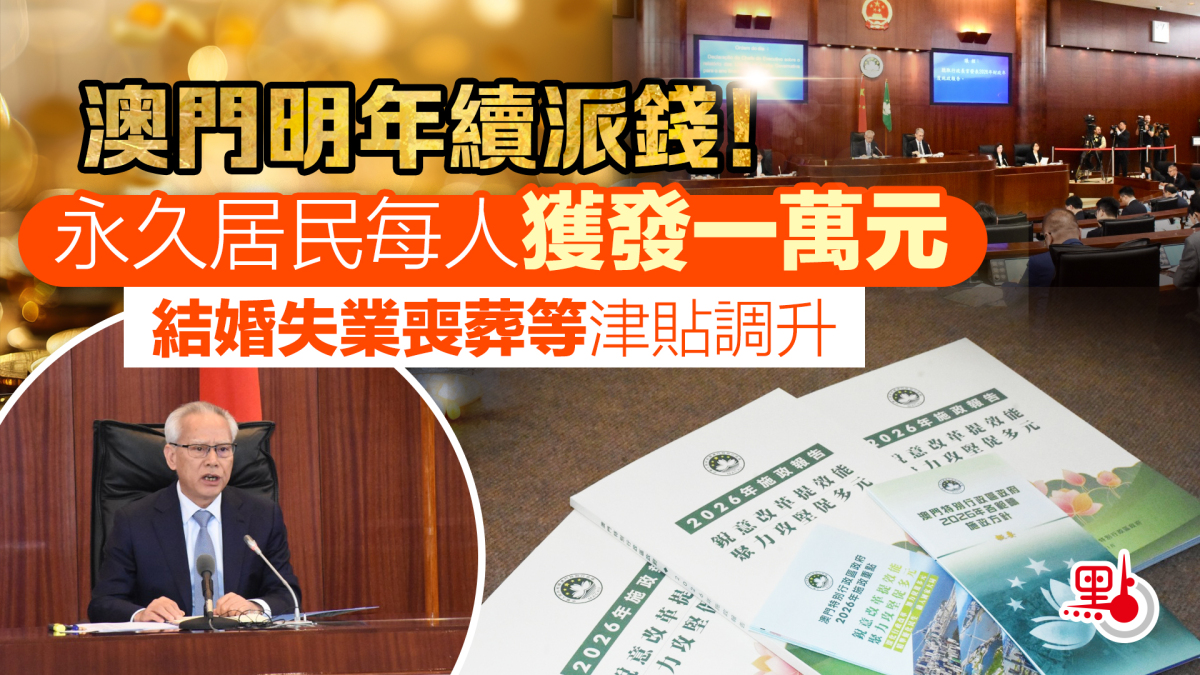 另外,部分惠民措施則有所調升,包括澳門居民參加內地醫保制度津貼計劃,範圍擴展至廣東全省及福建省,補貼上限1000元;結婚津貼調升至4000元,合資格配偶雙方可同時領取;失業津貼調升至每日210元;喪葬津貼亦調升至5200元;疾病津貼非住院調升至每日180元、住院調升至每日240元。