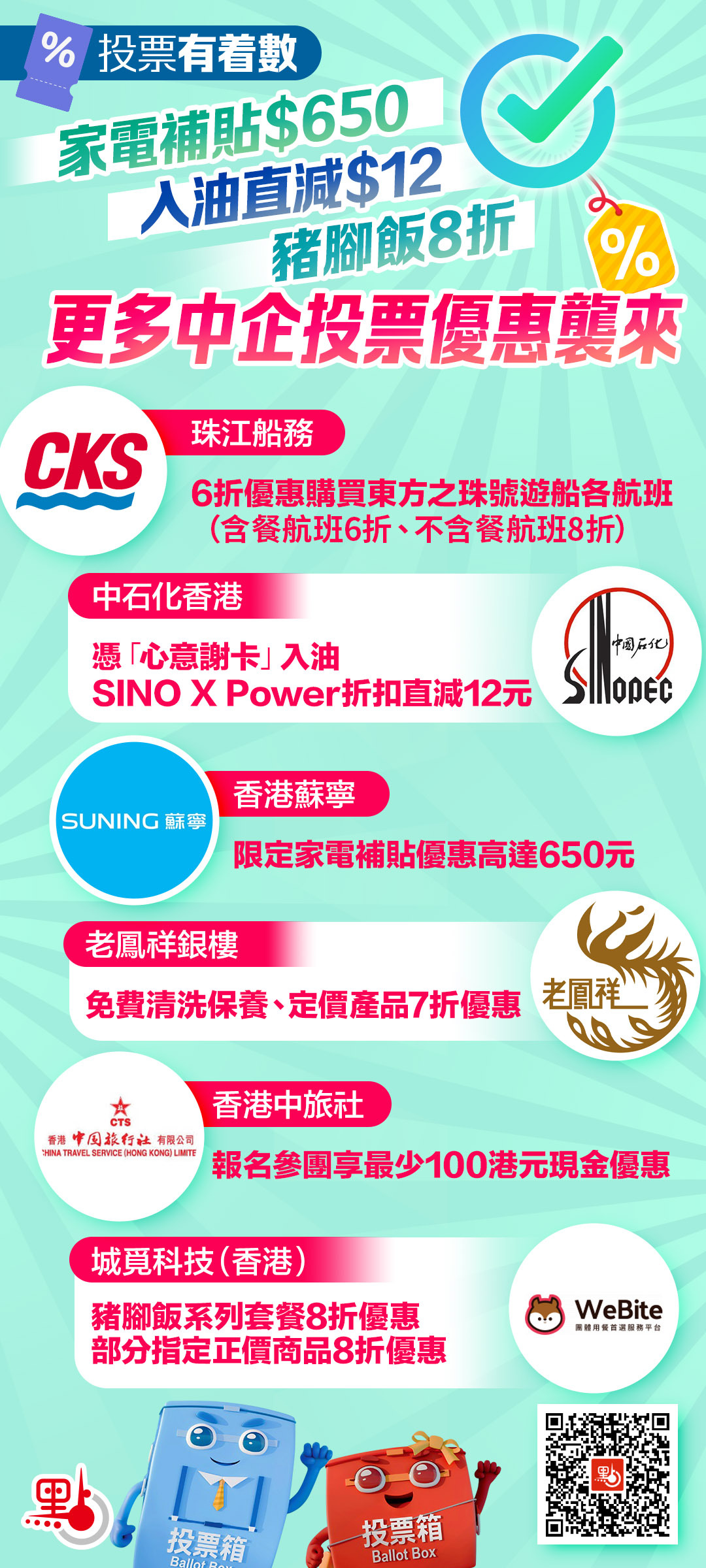 【點新聞報道】立法會換屆選舉投票日12月7日不斷臨近,香港街頭巷尾選舉氛圍日益濃厚,不少企業、社團、商家用實際行動為選舉助力。在這股熱潮中,由香港大公文匯傳媒集團發起的「投票有着數」活動獲得社會各界巨大迴響,眾多中資企業紛紛支持,推出各項折扣鼓勵市民踴躍投票。除食肆、超市等餐飲業商家,新一輪優惠更拓展到公共交通、家電、珠寶首飾等各範疇。市民只需要持投票「心意謝卡」就可盡享優惠。