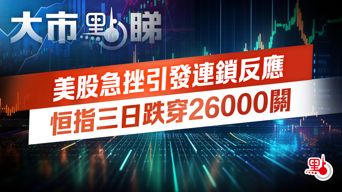 【點新聞報道】港股今日(18日)再度受美股大幅急挫至近低位收市而跟調整。三大指數早上齊跟低開後,曾見輕微收窄跌幅。惟在沽壓極重和欠缺承接力下,再次向下滑至跌穿26000關口。並逐步擴大跌幅。午後跌勢更見急速加劇,恒指低見25843,最多跌540點,跌幅超過兩個百分點。而國企指數和科技指數則分別最多跌186點及139點。續在低位附近橫行至收市。