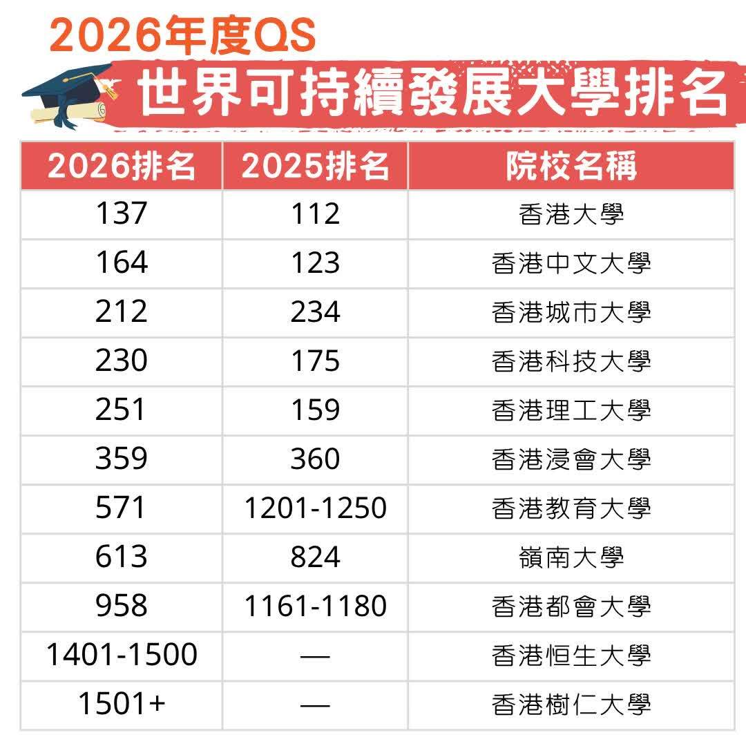 至於港大、中大、科大及理大的排名雖較去年有所下降,但QS指出,港大在環境研究與知識交流指標方面表現突出,特別是在氣候科學及健康體系領域,與《香港氣候行動藍圖2050》目標高度契合。在「就業與機遇」指標中,港大位列全球第二;在「環境研究」指標中,港大、理大和中大分別位列全球第14、20及25位。城大從全球234位上升至212位,浸大微升一位至359位。