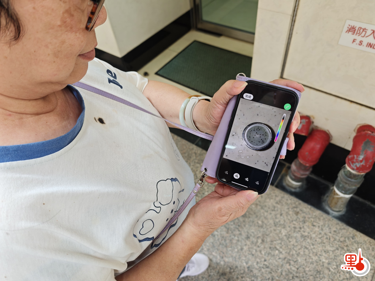 同廈住戶林女士表示,她家中食水前日起亦出現大量黑色小點,直言「好恐怖」。她向記者展示了今早拍攝的照片,赫然可見水管濾網上有數顆黑色顆粒。林女士將家中熱水器拆開觀察,沒想到「黑點」在內部也沾有不少。林女士告訴記者,情況並非個例,已有不少街坊到管理處登記投訴,還有部分居民因加裝濾水器而並未及時發現。在大廈樓下,點新聞記者看到門口已貼有相關告示,表示接獲業主反映食水有沉積物及水壓問題。