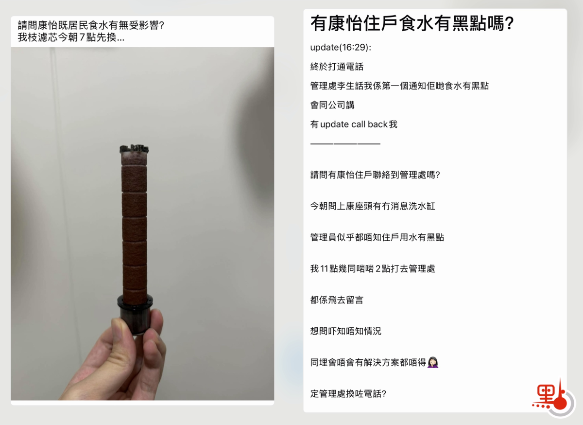 記者詢問康怡花園管理處,管理處工作人員向記者透露,確有住戶反應這幾日食水出現「黑點」。不過,在記者的隨機訪問中,住在G棟同D棟住戶反映有「黑點」,其他住客則表示未有留意。
