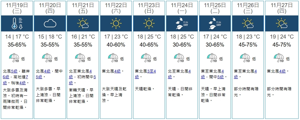 預計本周後期,隨着廣闊雲帶轉薄及東北季候風緩和,華南地區天色逐漸好轉,氣溫回升,但早上仍然清涼。至下周初,受乾燥季候風影響,華南普遍晴朗,日夜溫差較大。(點擊查看分區天氣預報)