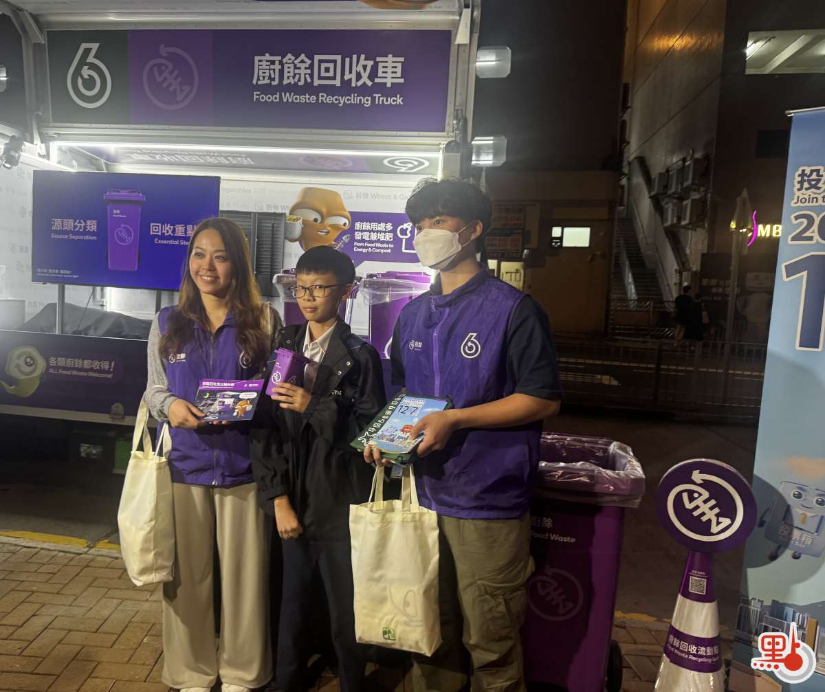 在廚餘車旁,有穿着制服的宣傳大使在場,親自引導市民如何在家中把廚餘分類。車上還會有屏幕播放教育片和主題曲,配合燈光效果,好似一個小型街頭表演,吸引過路小朋友一起玩住學。