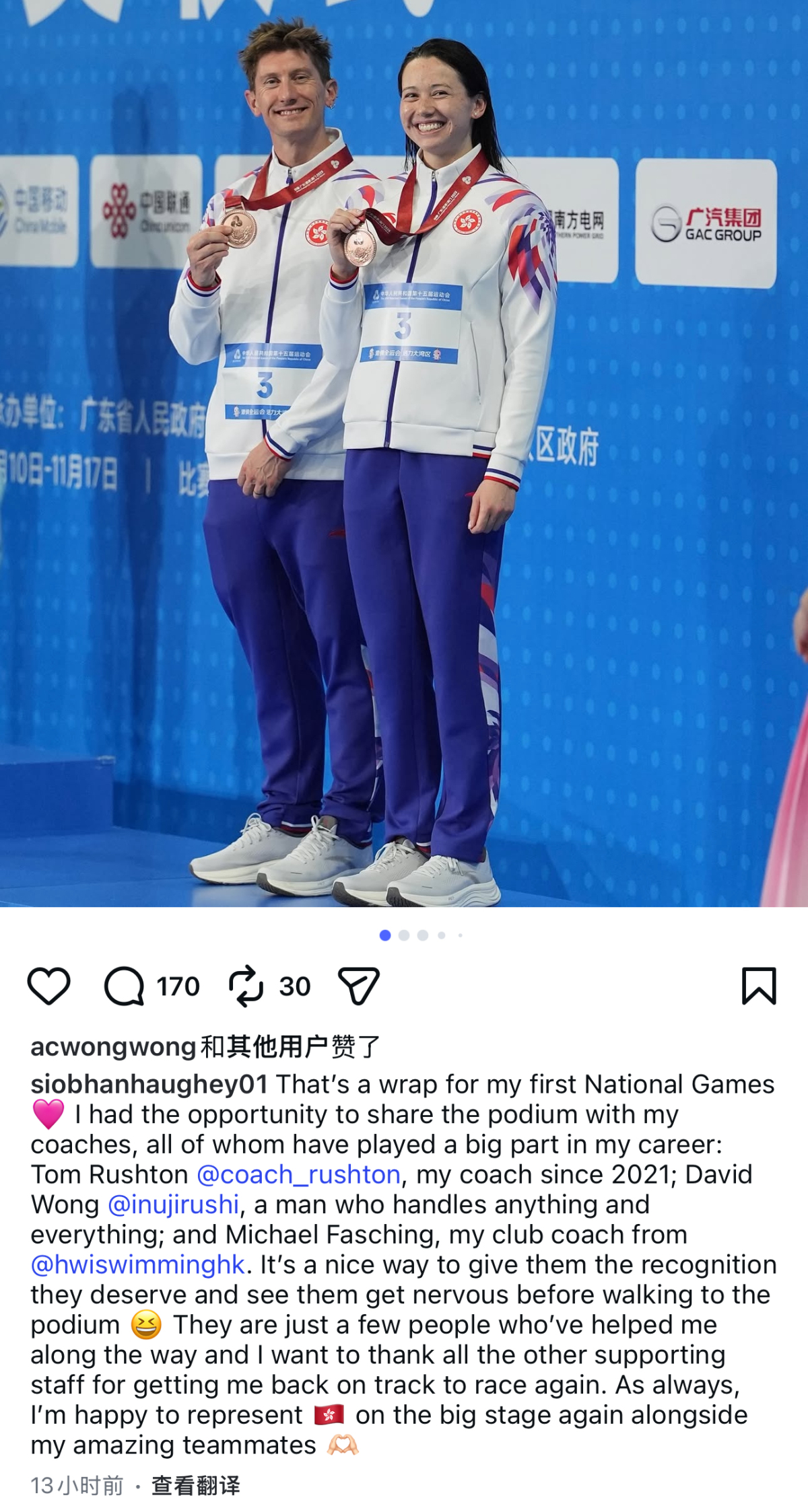 何詩蓓11月18日更新社交平台曬照總結全運會,她寫道:「這是我的第一次全運會之旅,很高興能和我的教練們分享領獎台,也感謝所有的工作人員,我很開心能夠和我的隊友們站上大舞台。」
