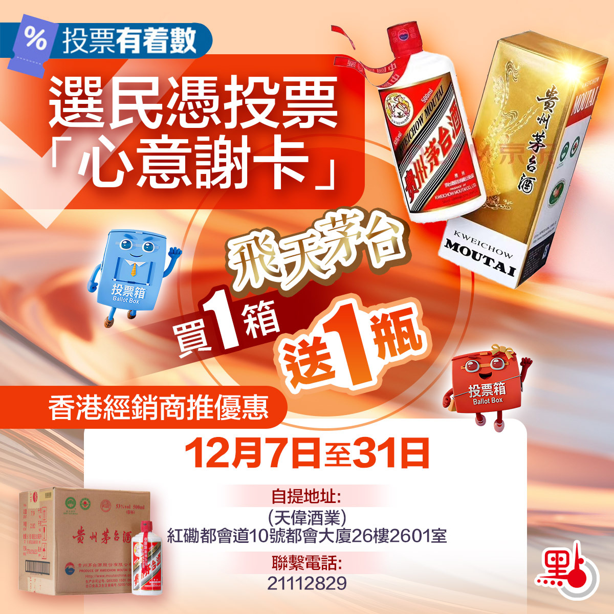 【點新聞報道】新一屆立法會選舉投票將於12月7日舉行,為鼓勵市民盡公民責任、積極參與投票,香港大公文匯傳媒集團本月10日獨家發起「投票有着數」活動,邀請商戶企業為已投票的選民提供優惠,獲各界熱烈響應。貴州茅台酒股份有限公司香港經銷商天偉(酒業)國際貿易有限公司亦推出優惠,12月7日至31日,選民憑投票「心意謝卡」購買普通飛天茅台酒,可享「買一箱送一瓶」優惠(12瓶/箱)。