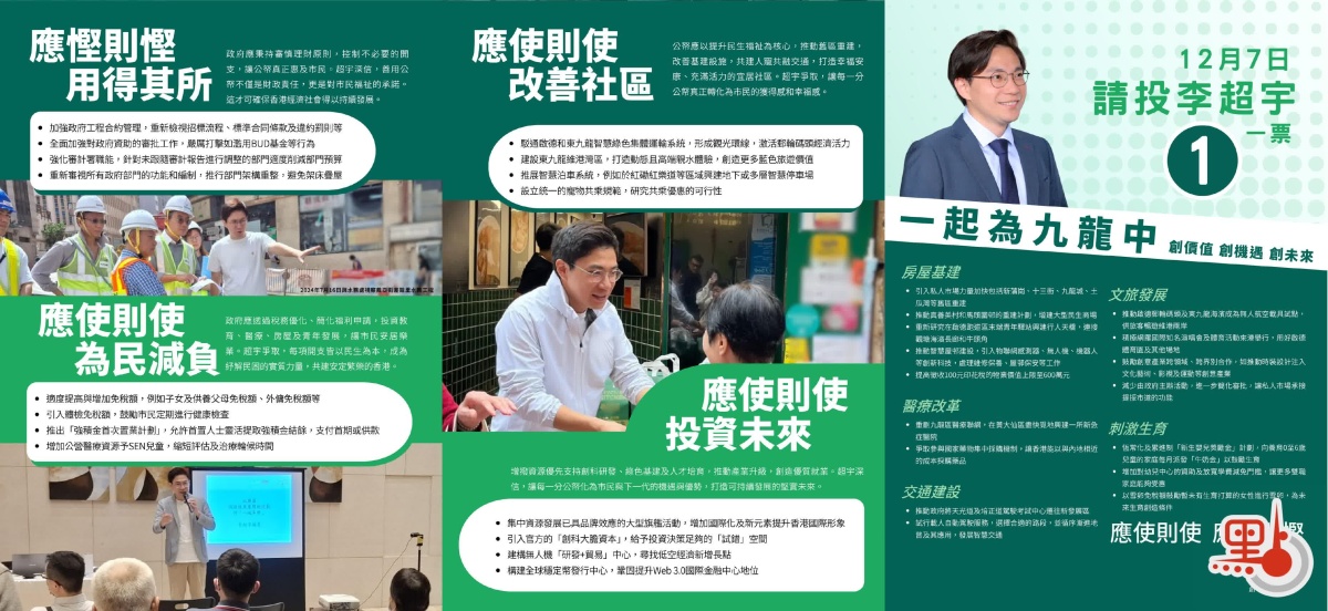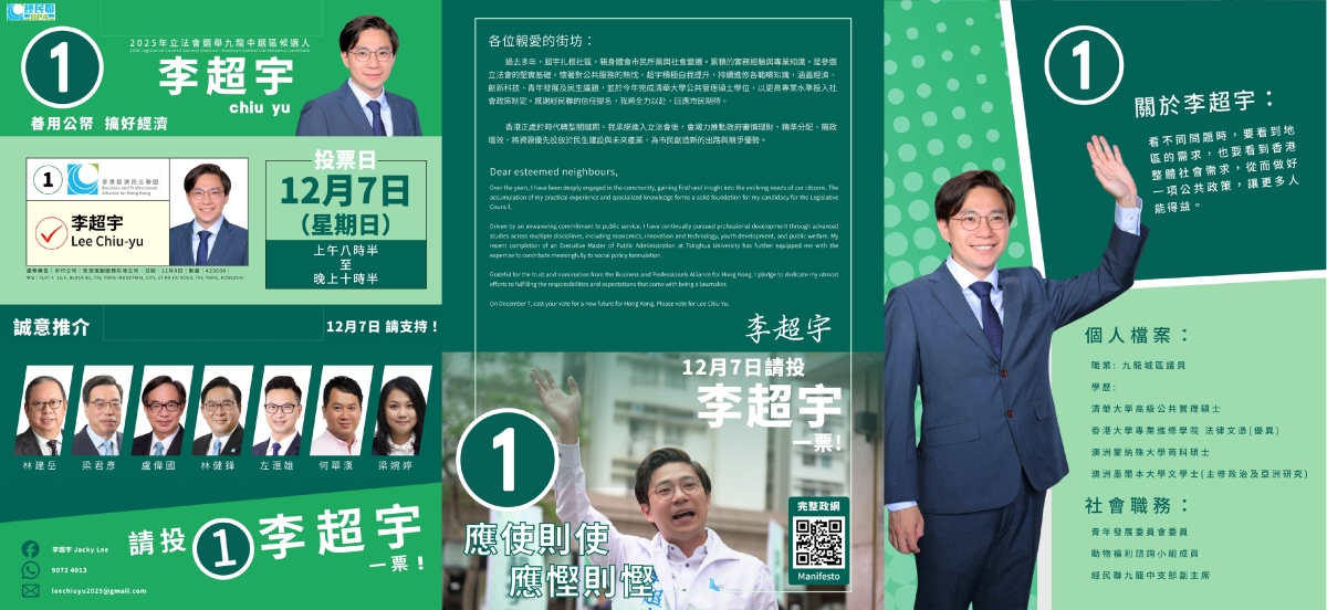 來自經民聯的1號候選人李超宇,為九龍城區現任區議員。經濟方面,他主張政府堅持「應使則使,應慳則慳」原則,並爭取設立子女教育免稅額、子女醫療保險免稅額等,以減輕家庭負擔;他支持政府放寬上市監管限制,吸引更多企業來港上市,增強香港國際金融中心的地位。青年發展方面,他建議政府設「創科大膽基金」以支持新興產業;積極引入國際級盛事,集中資源發展已具品牌效應的大型旗艦活動,以及打造低空觀光試點等,促進就業機會增長。