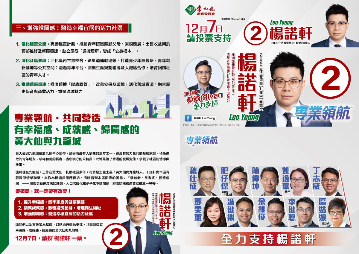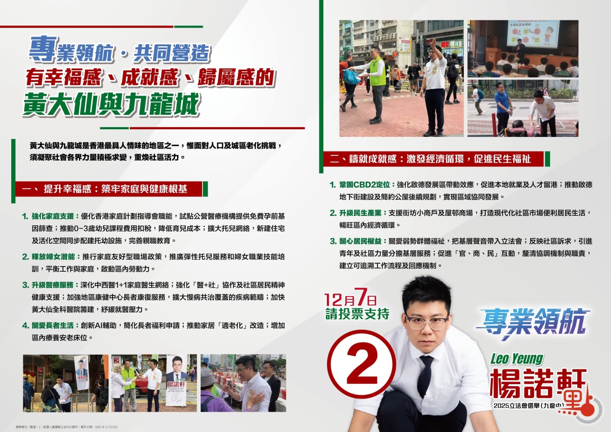 2號候選人楊諾軒現任黃大仙區的區議員,他認為,經濟方面要以鞏固九龍東作為香港第二核心商業區(CBD2)的定位為核心,支持啟德地下街等項目及簡約公屋後續配套規劃,支援小商戶與屋邨商場數碼化轉型。交通方面,他建議加快「東九龍過山線」延伸至慈雲山及竹園,同時優化九龍中與北都的跨區連接,並增建智能停車設施及戶外充電樁。青年發展方面,他建議活化空置校舍作為青年文創空間、社區活動場地等,強化職涯規劃、創業支援及大灣區交流實習,培育青年國際視野。