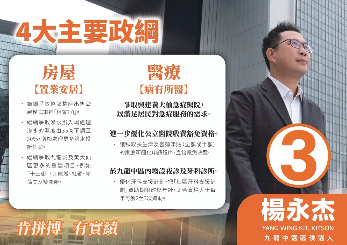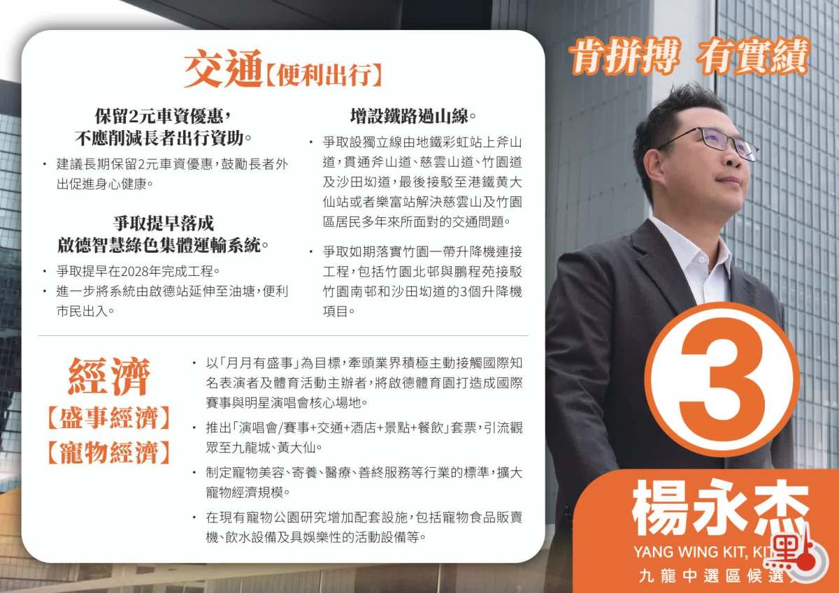 3號候選人、現任立法會議員楊永杰倡推「盛事經濟」與「寵物經濟」,打造啟德體育園為國際賽事及演唱會核心場地。交通方面,他建議興建第四條過海隧道並保留2元乘車優惠;爭取將「啟德智慧綠色集體運輸系統」提速至2028年完工。青年發展方面,楊永杰建議深化香港專業教育學院與海內外職專院校合作、推動產業導向課程、完善學徒制度與持續進修資助機制,鼓勵中學參與職專文憑課程及推行「一試多證」模式,提升教育與產業需求的匹配度。