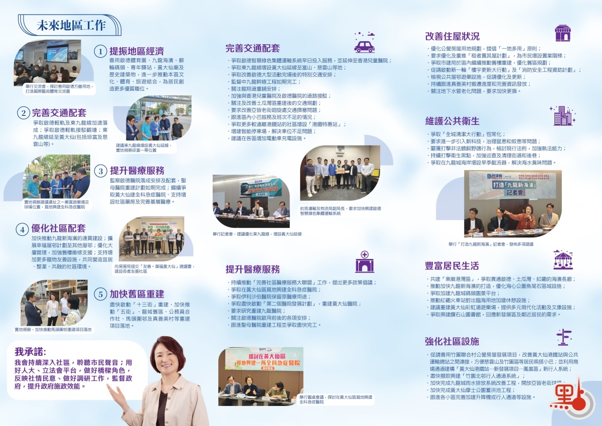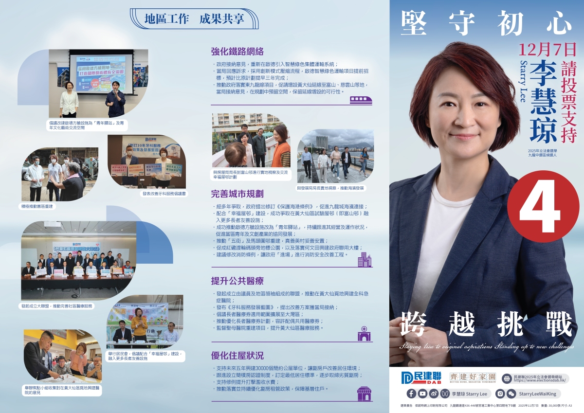 4號候選人、來自民建聯的現任立法會議員李慧琼則提出「提振地區經濟」,整合啟德體育園、九龍海濱、郵輪碼頭、青年驛站、黃大仙廟及歷史建築物等,推動本區文體旅融合發展。交通方面,李慧琼爭取啟德輕軌及東九龍線加速落成;爭取啟德輕軌接駁至觀塘;東九龍線延至黃大仙(包括瓊富及慈雲山等地)。她表示要用好「一國兩制」優勢,鞏固提升香港獨特優勢,加快推動香港成為創科中心,讓產業多元化,令市民有更好的工作,生活得更好。