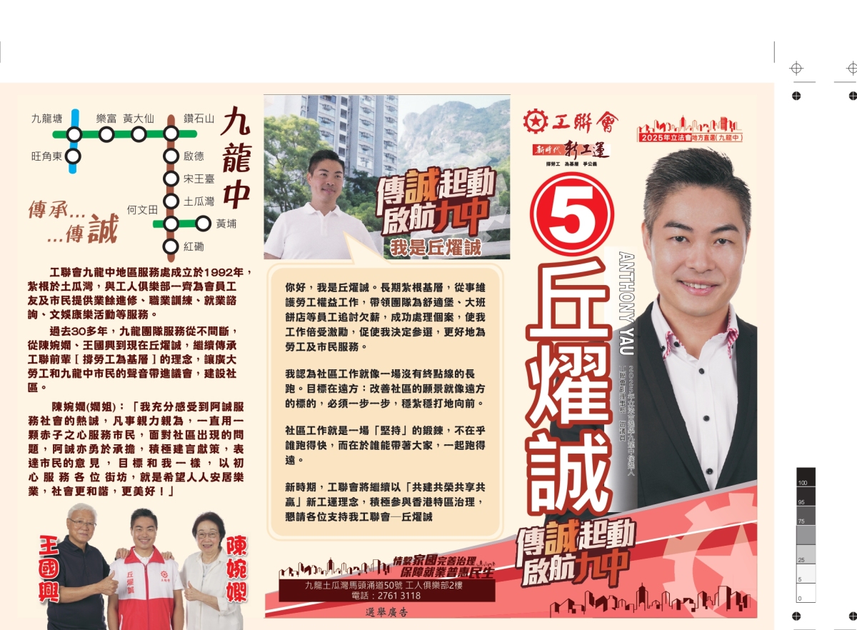 來自工聯會的5號候選人丘燿誠主張活化工廈為工貿區,並通過政商民合作提供優惠租金,支持青年文創產業發展,整合海濱、運動場館及古蹟等資源打造新旅遊文化區,以帶動經濟。至於交通問題,他爭取東九龍連接系統延至慈雲山、瓊富及竹園等地;建議優化當區醫院周邊交通安排,方便居民往返各醫院。丘燿誠倡導「告別劏房,由兒童開始」,建議有兒童的劏房家庭優先上樓或配給簡約公屋,並推動落實青年發展藍圖,增加海內外交流與實習機會。