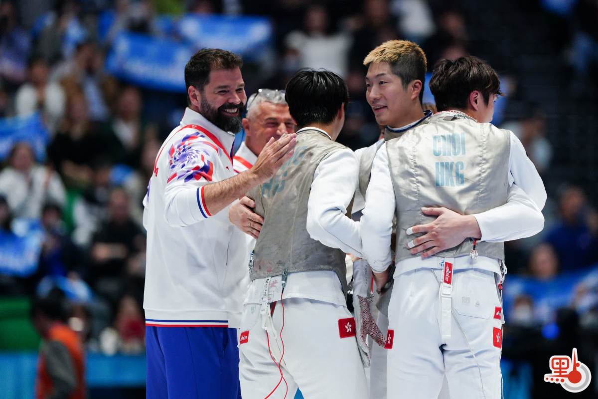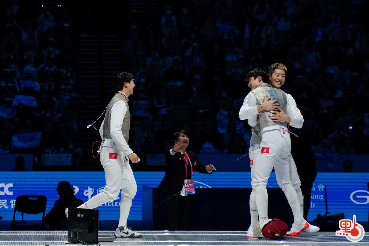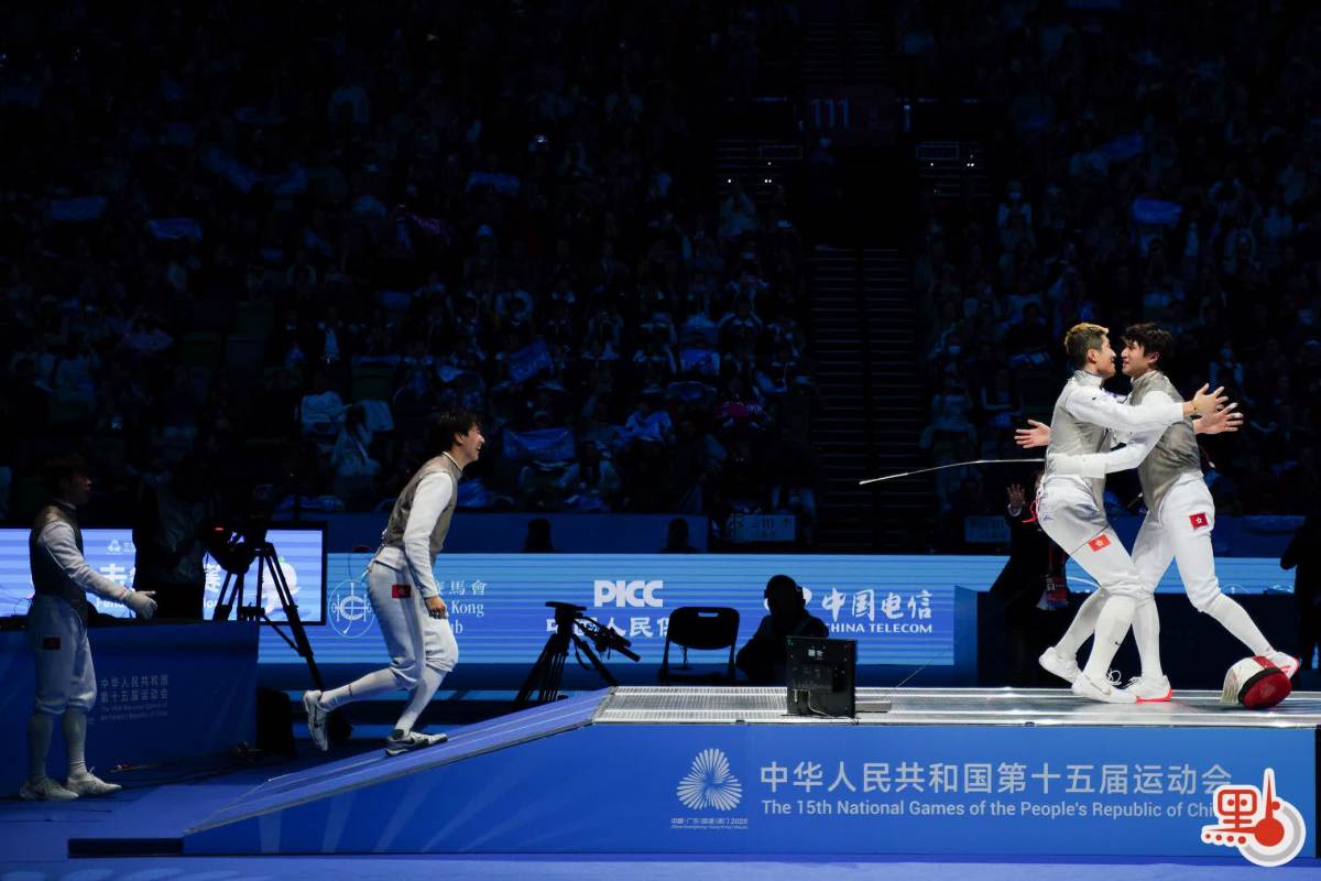 【點新聞報道】第十五屆全運會劍擊項目,一連6日在香港賽區啟德體藝館上演。由張家朗、蔡俊彥、梁千雨及吳諾弘組成的香港男子花劍隊,擊敗浙江晉級4強後,再以45比30大勝江蘇,首度躋身全運男團決賽,今(19日)晚7時半火併福建隊爭金牌。最終港隊45∶34大勝福建隊,首奪全運會男花團體成年組金牌,創造歷史。