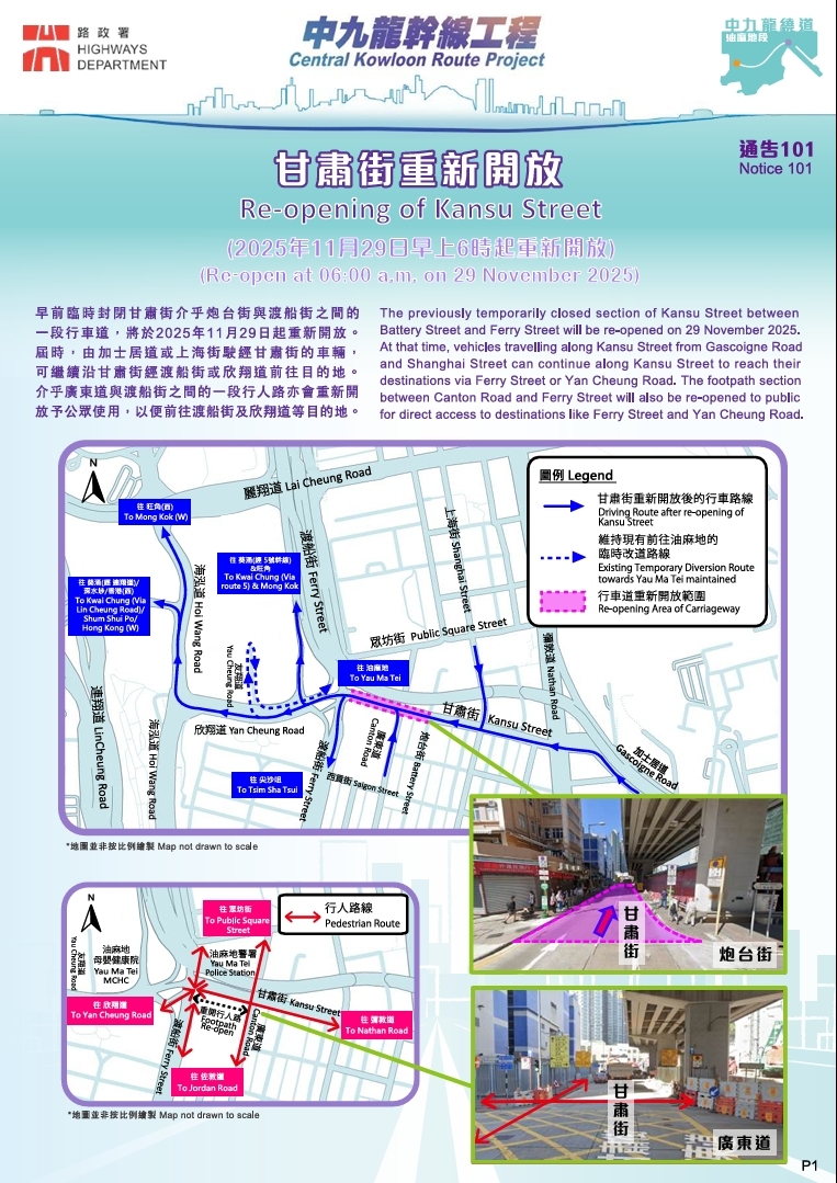 【點新聞報道】政府今日(20日)提醒市民,早前為配合興建中九龍繞道(油麻地段)而臨時封閉介乎炮台街與渡船街之間的一段甘肅街,將於11月29日(星期六)上午6時重新開放,並將實施交通及運輸安排。