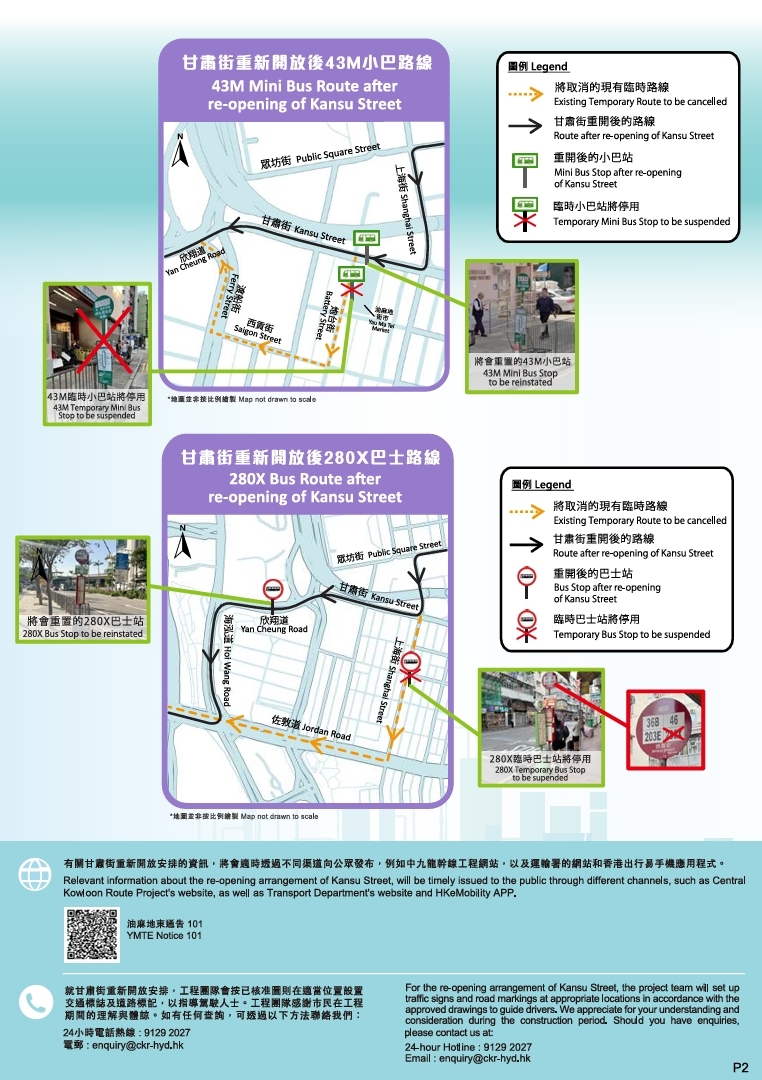 - 部分九巴第280X號線的巴士站,以及九龍專線小巴第43M號線的小巴站亦會重置。相關營辦商會張貼告示,通知乘客相關安排。