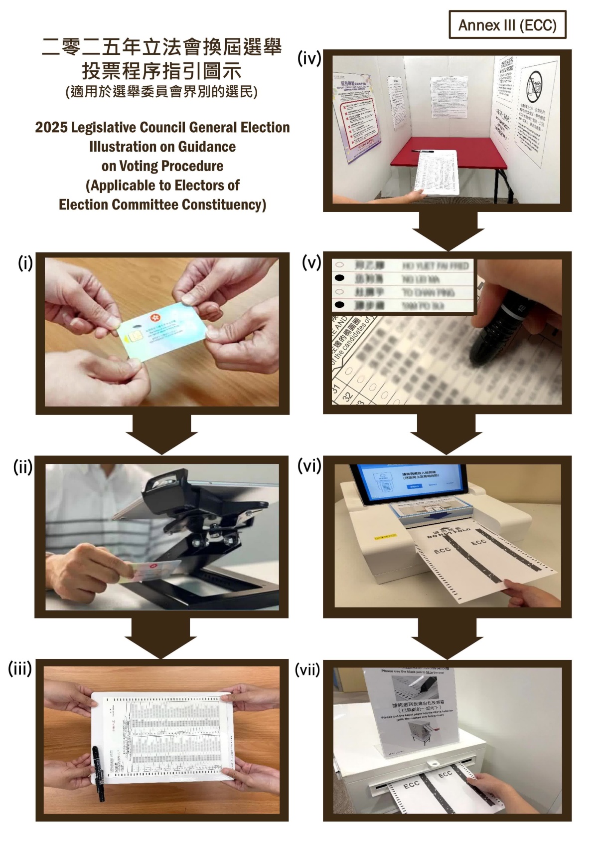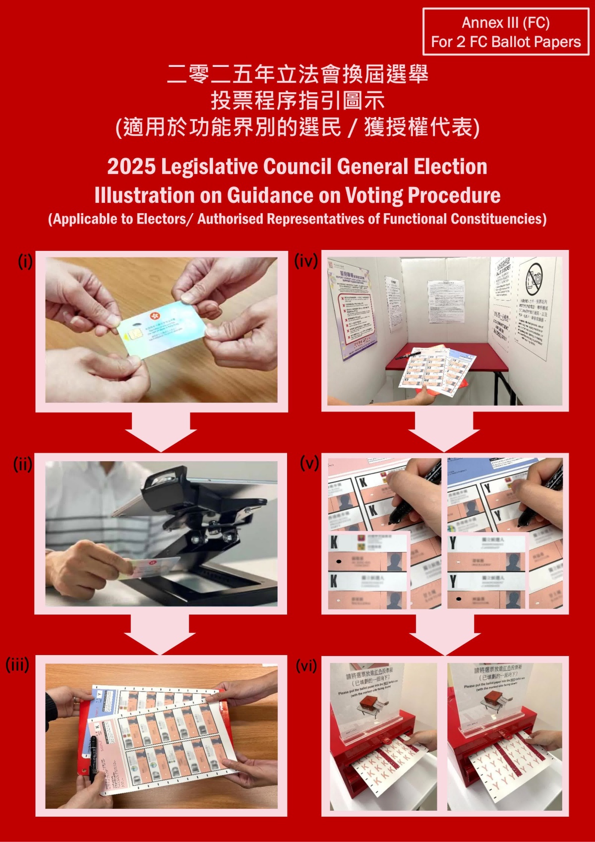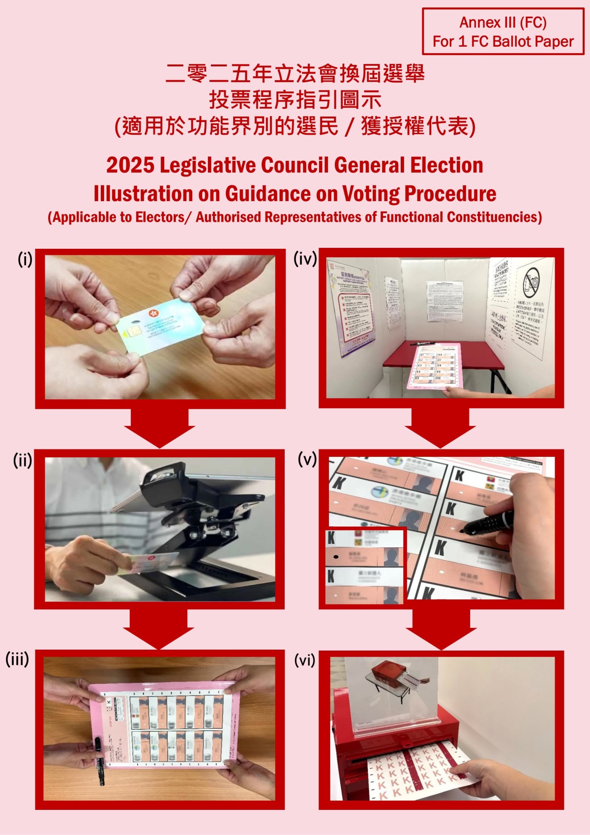 地方選區選民,在選票上蓋上一個剔號;功能界別選民,用黑色筆填滿選票上的橢圓形。將選票已填劃的一面向下,無須對摺,按指示放入指定投票箱。