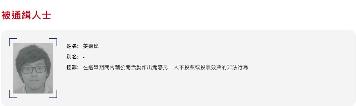 另外,廉署今早獲裁判官簽發手令,通緝已離港的姜嘉偉及湯偉雄。姜嘉偉,34歲;及湯偉雄,44歲,各面對兩項控罪,即在選舉期間內藉公開活動作出煽惑另一人不投票的非法行為,違反《選舉條例》第27A(1)(a)條。控罪指二人涉嫌在2025年立法會選舉的選舉期間,各自在其社交媒體專頁,展示煽惑他人在該選舉中不投票的帖文。