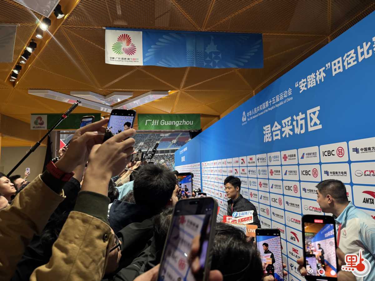蘇炳添的謝幕之戰也在混採區引發了一場媒體「鏖戰」。當晚,廣東奧體中心混採區氣氛熱烈,記者們早早守候在通道旁。當他賽後現身時,現場瞬間沸騰,記者們爭相上前採訪,在「千軍萬馬」的圍堵中遞出話筒,只為記錄下這位傳奇運動員的告別感言。