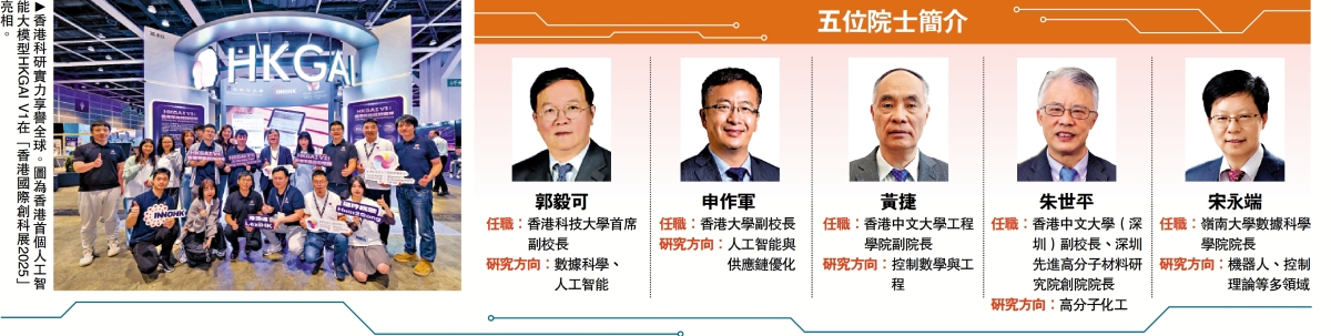 在中國工程院外籍院士增選方面,有5位香港工作背景的科學家當選「信息與電子工程學部」外籍院士。他們分別是香港科技大學首席副校長、計算機科學及工程學系講座教授郭毅可;香港中文大學工程學院副院長、卓敏機械與自動化工程學研究教授黃捷;香港大學副校長(研究)、工程學院及經濟及工商管理學院雙聘講座教授申作軍;香港中文大學(深圳)講座教授、副校長朱世平;以及嶺南大學數據科學學院院長、工業數據科學學部講座教授宋永端。