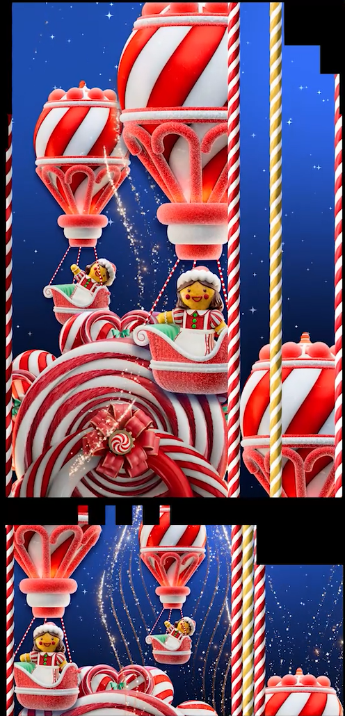 多幢中環地標搖身一變成巨型禮物,聖誕老人正忙碌包裝禮物。數之不盡的禮物突然拼湊一起,映現於大廈外牆,如同聖誕魔法瞬間綻放。