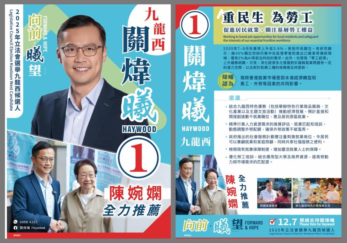 1號候選人關煒曦,現任油尖旺區議員。他致力推動結合九龍西地區傳統優勢和特色,例如促推文創產業、主題文旅活動和特色商品展銷等,創造就業職位,並以熱門景點為載體,發展特色經濟產業,推動舊油麻地警署成為地標式文創匯聚點。交通議題方面,關煒曦倡改善九龍西交通路網和步行環境,以提升九龍西的交通便利優勢,包括提升巴士路線和小巴路線的服務質量和覆蓋網,改善區內交通黑點設計,改進路面不平、過路不易等。至於青年發展方面,關煒曦倡議拓展應用型人才的課程,提升青年在職業跑道上的競爭力,善用現有社區設施或已完結的臨時建築物,增加青年活動空間,包括排演場所、供預約的共享辦公和會議室,為青年多元發展打下基礎。