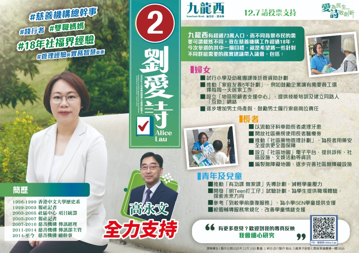 報稱慈善機構總幹事的2號候選人劉愛詩,強調年輕人是社會的未來,她主張從教育及青年發展着手,為他們找到更多可能性。她建議開發「明Teen打工仔」試驗計劃,為中小學生提供虛擬職場「體驗周」,透過實境體驗,讓學生發掘興趣同時了解社會運作,幫助他們探索路向,為未來發展定下目標。她建議,逐步強化「職學雙軌」發展,如善用應用科學大學為年輕人鋪設跑道,設計能配合年輕人興趣及經濟發展所需技能的課程,如電商及文創產業等,幫助他們發展事業。至於年輕人的住屋問題,劉愛詩倡優化「青年宿舍計劃」,在市區設立更多青年共居空間,以相宜租金助年輕人儲蓄,同時匯聚志同道合的年輕人共同發展及建立互助網絡,讓年輕人更有條件地選擇自己的發展方向。