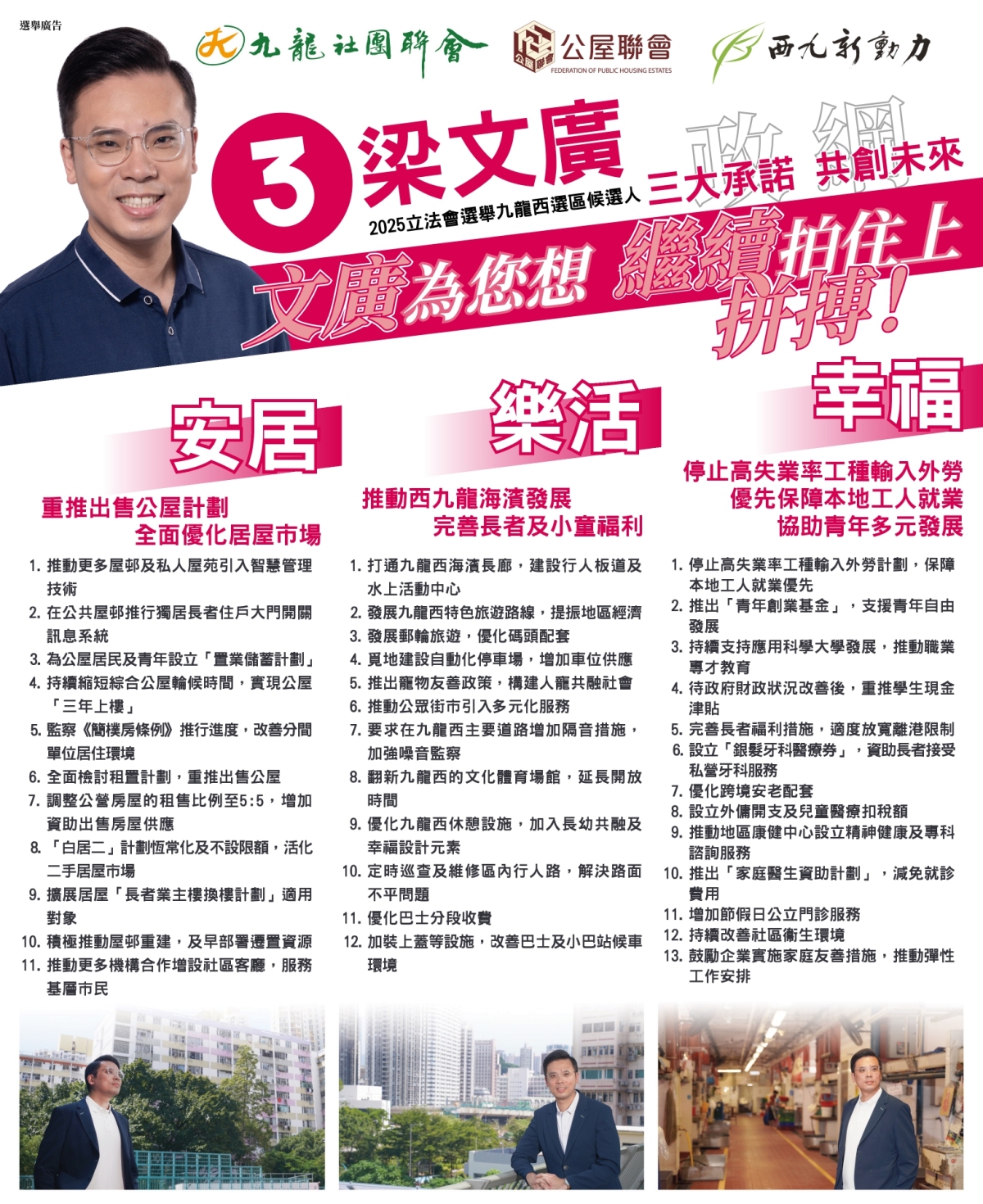 3號候選人梁文廣,為競逐連任的現任九龍西立法會議員。交通方面,他主張發展智慧交通,在西九龍高鐵站推行無人駕駛接駁服務,加強區域聯動;增設更多自動化停車場及夜間商用車位,解決「泊車難」問題。公共交通方面,他支持推動優化巴士分段收費、改善候車環境等。青年發展上,梁文廣爭取重推「夾心階層住屋計劃」、豁免首置印花稅及引入漸進式按揭,減輕青年「上車」負擔。青年發展方面,他積極協助青年創業,同時推動職專教育與產業接軌,開拓多元發展路徑;至於經濟,梁文廣倡議積極發展地區旅遊、演唱會經濟及郵輪旅遊等新型旅遊產品,同時優化街市及排檔政策,活化廟街、深水埗鴨寮街等文化地標,打造特色街區,激發社區經濟活力。