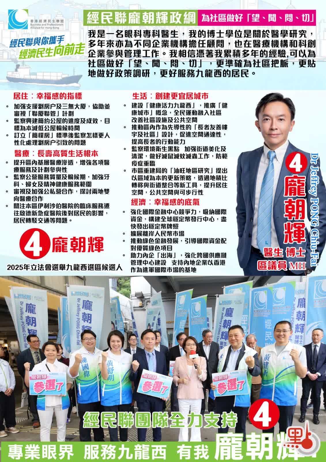 4號候選人、來自經民聯的龐朝輝,為現任深水埗區議員。他表示,自己從事地區工作達17年,除區議員外,亦是一名眼科專科醫生,有企業管理及醫學研究經驗,能透過自身專業領域及地區經驗服務市民。他指出,房屋問題是幸福感的核心指標 ,未來要加强支援劏房户及「三無」大厦,檢視「簡樸房」訂立後對劏房户的影響,審視「聯厦聯管」成效。同時,龐朝輝提出,要改善醫療服務質素及協同效應,提升基層醫療滲透率,審視及加强公私營合作,探討兩地雙向醫療合作;致力發展經濟,鞏固提升國際金融、航運、創新和貿易中心地位以及其他標誌性產業,部署對接「十五五」規劃;推動專業服務發展, 引才、留才、育才;共建長者友善、健康活力、宜居的九龍西。