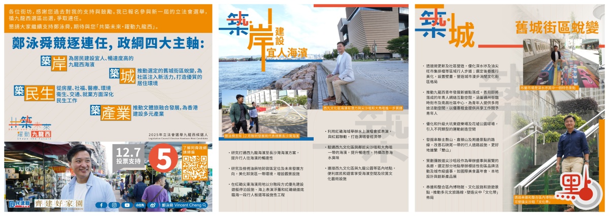 5號候選人鄭泳舜,為競逐連任的現任九龍西立法會議員,來自民建聯。鄭泳舜認為,在地區經濟方面,需發展多元化產業及盛事經濟,推動文體旅融合,包括推動彌敦道尖沙咀段作為舉辦盛事與展覽的長廊,選定部分地點舉辦標誌性街區品牌活動及城市級盛事等;善用九龍西地標性景點及場地舉辦盛事,開拓體育旅遊,發展主場經濟。交通方面,他促善用橋底空間等增加泊車位,並增設智能停車場;完善中九龍幹線一帶公共交通配套規劃,包括增設往來社區與啟德醫院的巴士路線;建議豁免首置者全數住宅印花稅,樓價上限1000萬元,減輕青年置業負擔;推動落成九龍西青年發展新據點,提供優惠共享空間支持創業,打造屬於年輕人的互動平台,為青年創造機會。