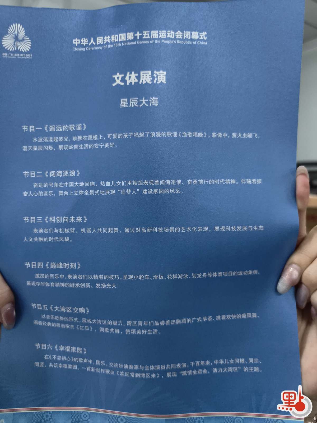 點新聞記者看到節目單上,今晚的演出共分六個篇章:《遙遠的歌謠》《闖海逐浪》《科創向未來》《巔峰時刻》《大灣區交響》和《幸福家園》。《遙遠的歌謠》開場,水波蕩漾起波光,映照在屋簷上,可愛的孩子唱起了浪漫的歌謠《漁歌唱晚》。影像中,螢火蟲飛舞,漫天星辰閃爍,展現嶺南生活的安寧美好。《闖海逐浪》中,奮進的號角在中國大地迴響,熱血兒女們用舞蹈表現着闖海逐浪、奮勇前行的時代精神。伴隨着振奮人心的音樂,舞台上立體全景式地展現「追夢人」建設家園的風采。