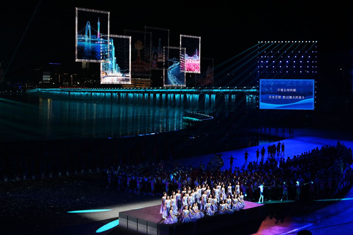 閉幕式首次採用海濱實景舞台,以「海天一色」為背景,為觀眾帶來沉浸式體驗。文藝展演《星辰大海》以《遙遠的歌謠》開篇,通過疍家民謠、改革開放經典畫面重現、科技與人文共舞等篇章,展現了嶺南文化、特區精神與大灣區創新活力。壓軸環節,全場合唱《友誼地久天長》,深情落幕。