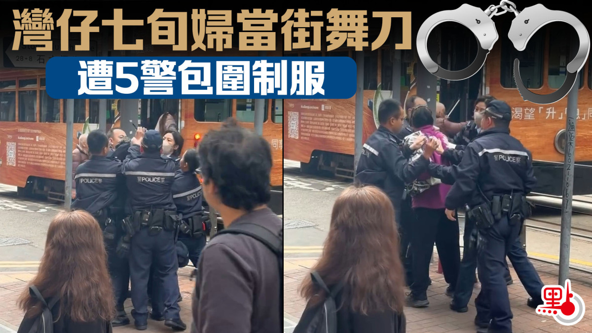 【點新聞報道】灣仔街有老婦揮舞鎅刀,最終被5名警員合力制服。網上流傳一段影片,可見一名身穿桃紅色上衣、手持鎅刀的老婦,在莊士頓道與石水渠街交界,被5名警員包圍,老婦情緒激動,不斷揮動手上的鎅刀,最終一名男警在混亂間奪去鎅刀交予同袍,老婦被鎖上手扣。
