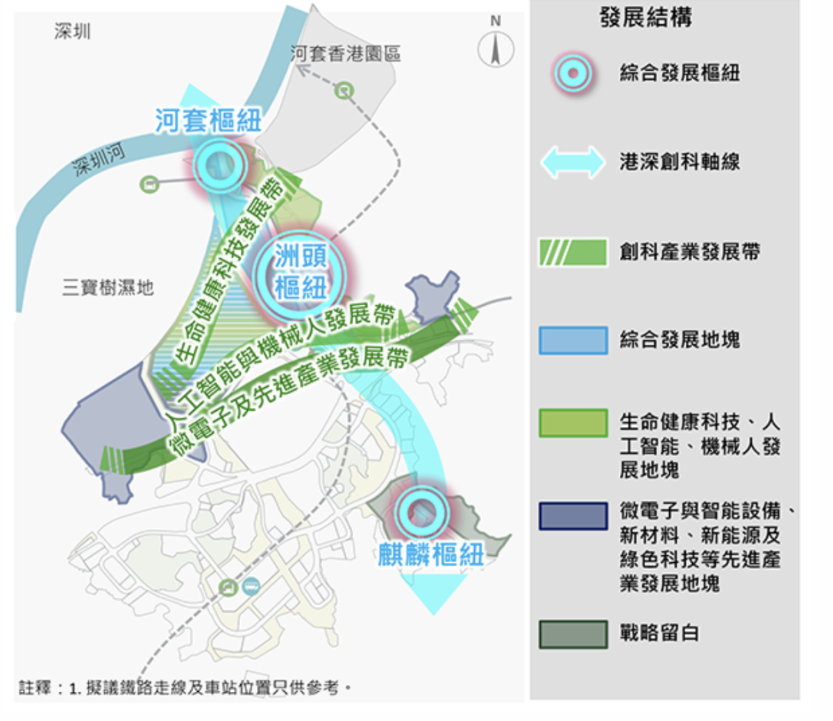 新田科技城的空間規劃主要遵照分期策略、地塊產業用途、功能設計,以及生活配套的設計思路。孫東表示,用地布局以「三紐、三帶」劃分,由北至南為河套樞紐、洲頭樞紐及麒麟樞紐,以三個樞紐為核心布局產業發展帶,最北側聯動河套香港園區以發展生命健康科技為主,而洲頭樞紐南側則更多聚焦人工智能與機械人,以及微電子與先進製造等,同時圍繞麒麟樞紐設有戰略留白區。通過引入龍頭企業可吸引更多上下游產業落戶,形成群聚效應。他續指,《概念綱要》亦建議新田科技城聚焦產業、人才和空間三個元素之間的互動,在「以產優城、以城引人、以人築產」的原則下,打造「產城融合」的宜居城市。