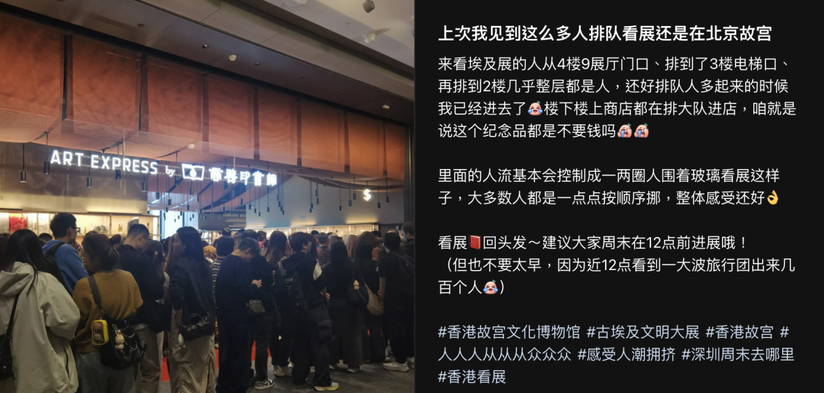 【點新聞報道】香港故宮文化博物館與埃及最高文物委員會聯合主辦的「古埃及文明大展——埃及博物館珍藏」本周四(20日)起向公眾開放。展覽踏入首個周末(22日)迎來人潮,現場人數眾多,同時每個展館外都「打蛇餅」,排隊最少需時一小時以上。