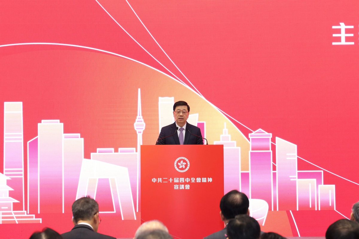 李家超分享三點體會:第一,我們必須深入理解和領會二十屆四中全會精神,掌握國家未來發展方向和香港的機遇;第二,我們必須守正創新、因地制宜、因時制宜推進各方面的工作,尤其要鞏固提升香港的獨特競爭優勢,更好融入和服務國家發展大局;第三,我們必須將二十屆四中全會精神融匯貫通在日常事務中。