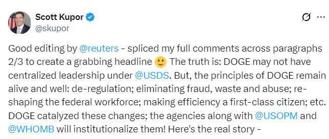 隨後,庫珀本人在社交媒體上發文,對路透社的報道進行了反駁。他表示,「政府效率部」或許不再會有「集中化的領導」,但其工作準則將繼續保留:減少章程架構;減少欺詐、浪費和濫用;重塑聯邦人力結構;將效率放在首位等等。「政府效率部」催動了相關變革,美國人事管理局、白宮管理和預算辦公室一起將其制度化,「這才是真相」。