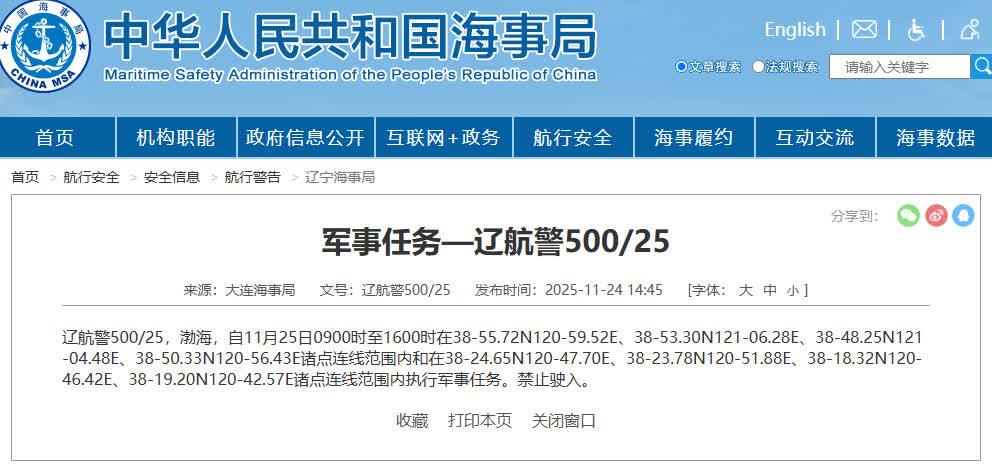 遼航警500/25,渤海,自11月25日09:00時至16:00時在38-55.72N120-59.52E、38-53.30N121-06.28E、38-48.25N121-04.48E、38-50.33N120-56.43E諸點連線範圍內和在38-24.65N120-47.70E、38-23.78N120-51.88E、38-18.32N120-46.42E、38-19.20N120-42.57E諸點連線範圍內執行軍事任務。禁止駛入。