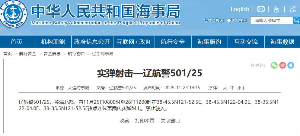 遼航警501/25,黃海北部,自11月25日08:00時至28日12:00時在38-45.5N121-52.5E、38-45.5N122-04.0E、38-35.5N122-04.0E、38-35.5N121-52.5E諸點連線範圍內實彈射擊。禁止駛入。