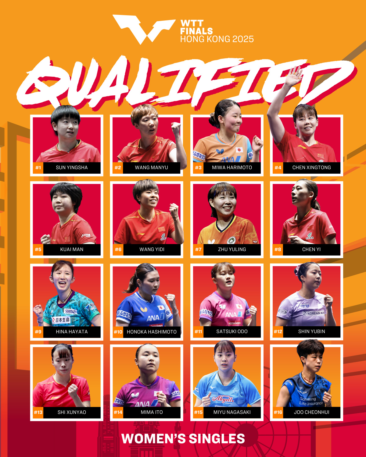 孫穎莎、王曼昱、陳幸同、蒯曼、王藝迪、陳熠、石洵瑤、朱雨玲、申裕斌、朱芊曦、張本美和、早田希娜、橋本帆乃香、大藤沙月、伊藤美誠、長崎美柚