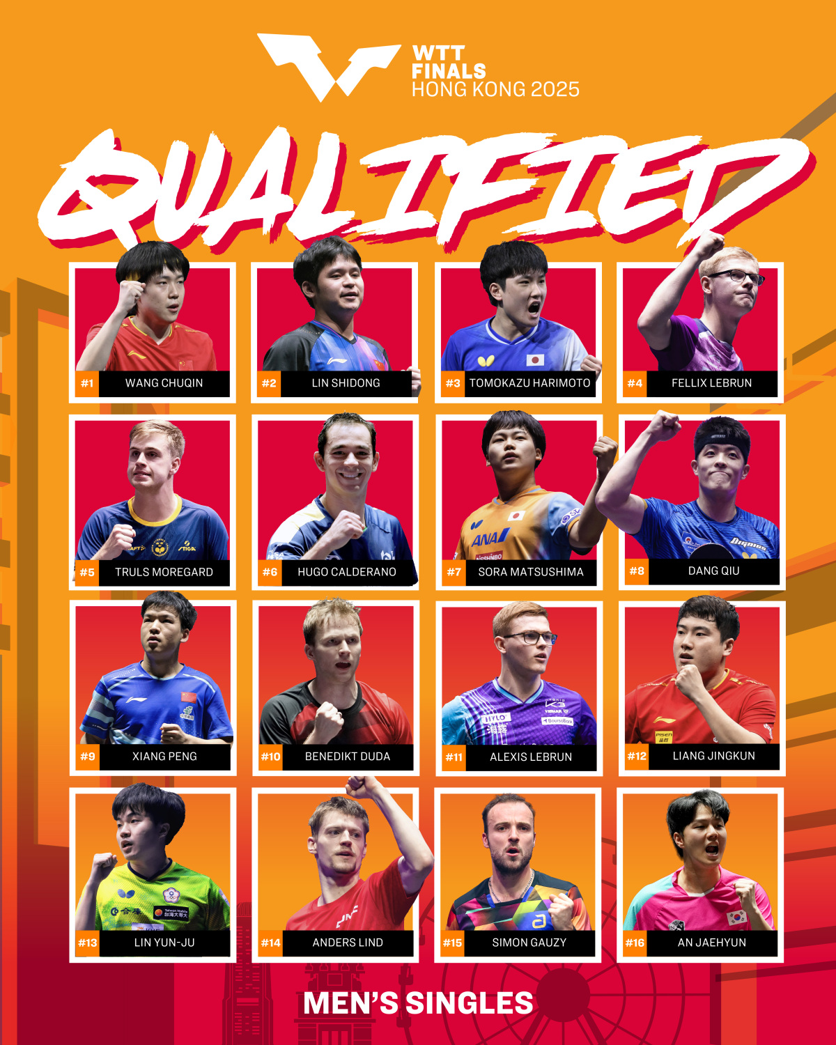 王楚欽、林詩棟、張本智和、費利克斯·勒布倫、特魯斯·莫雷加德、雨果·卡爾德拉諾、松島輝空、邱黨、向鵬、貝內迪克特·杜達、艾利克斯·勒布倫、梁靖崑、林昀儒(中國台北)、安德斯·林德、西蒙·高茨、安宰賢