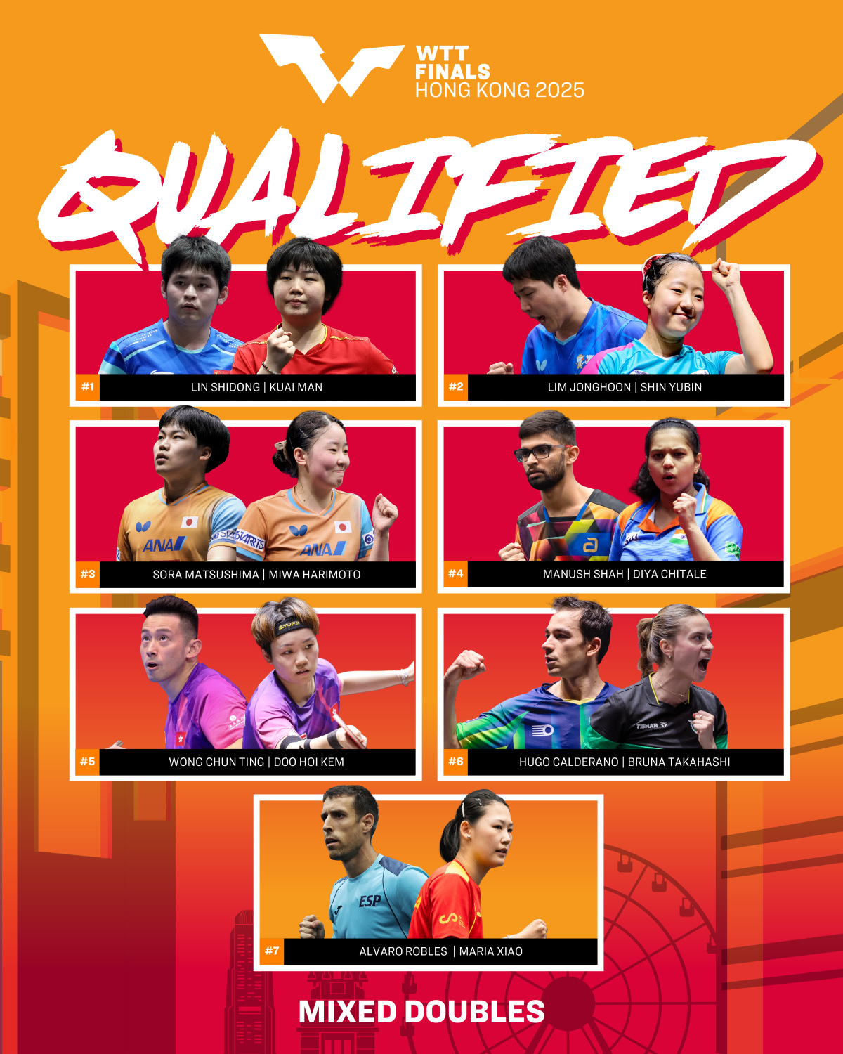林詩棟/蒯曼、林鐘勳/申裕斌、松島輝空/張本美和、瑪納什·沙/奇塔萊、黃鎮廷/杜凱琹、卡爾德拉諾/高橋·布魯娜、羅伯勒斯/肖瑤茜