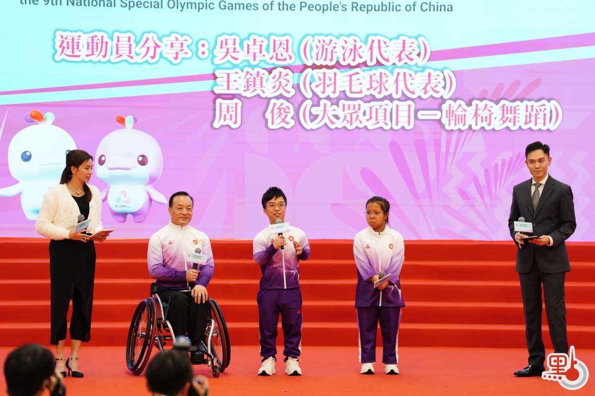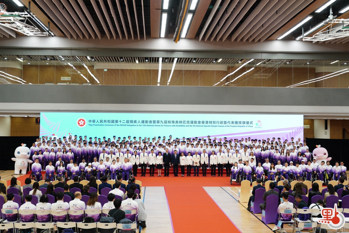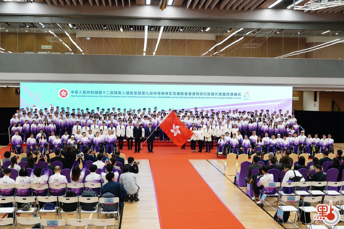 【點新聞報道】第十二屆殘疾人運動會(殘運會)暨第九屆特殊奧林匹克運動會(特奧會)(合稱殘特奧會)香港特別行政區(特區)代表團授旗儀式,今日(24日)下午在調景嶺體育館舉行,行政長官李家超主持授旗儀式。其他主要嘉賓包括中央人民政府駐港聯絡辦副主任孫尚武、文化體育及旅遊局(文體旅局)局長兼香港特區代表團團長羅淑佩、中國香港殘疾人奧委會會長兼代表團籌備委員會(籌委會)主席馮馬潔嫻、中國香港體育協會暨奧林匹克委員會會長兼籌委會主席霍震霆等。