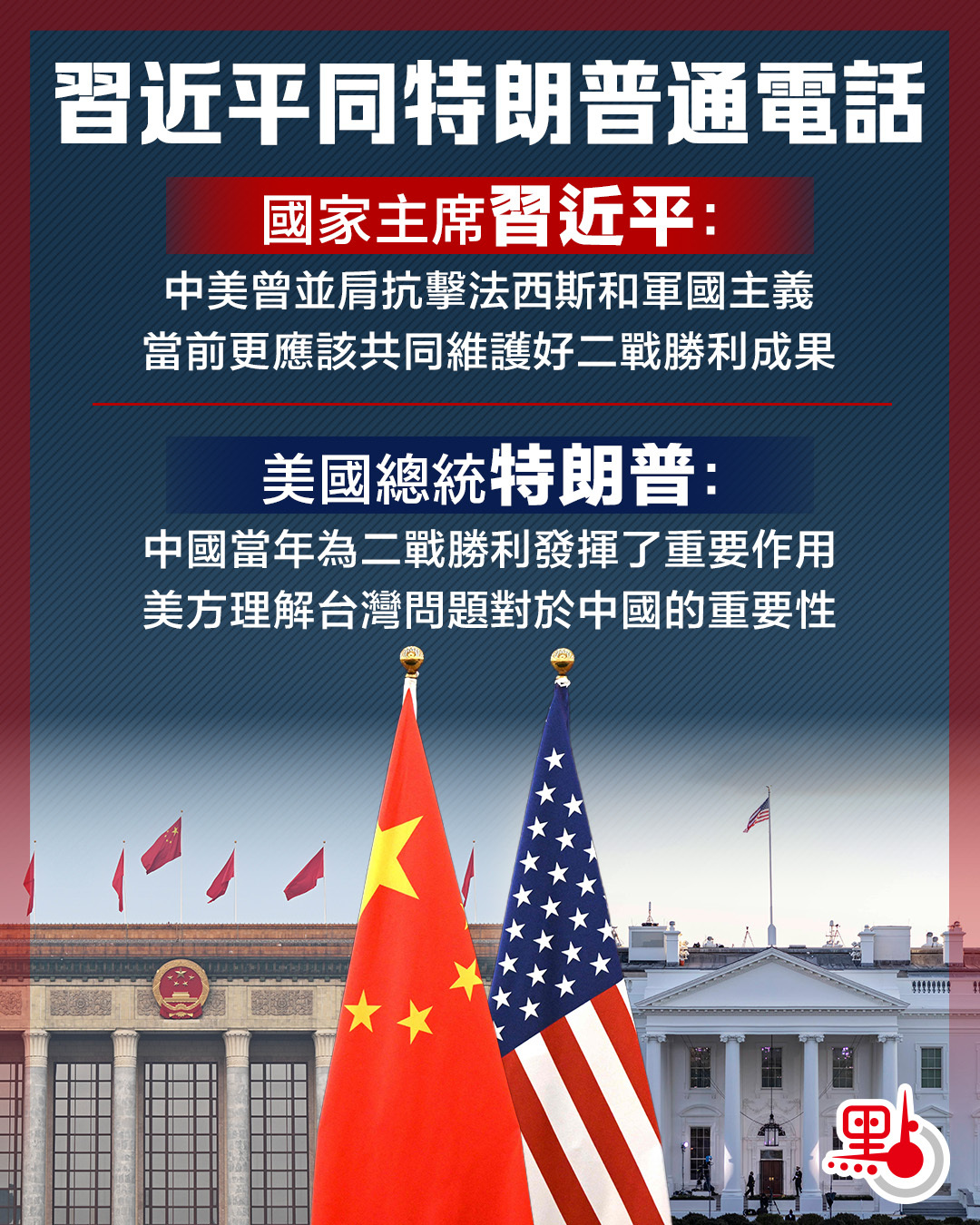 特朗普表示,習近平主席是偉大的領導人。我同習近平主席在釜山的會晤非常愉快,完全贊同您對兩國關係的看法。雙方正在全面落實釜山會晤達成的重要共識。中國當年為二戰勝利發揮了重要作用,美方理解台灣問題對於中國的重要性。