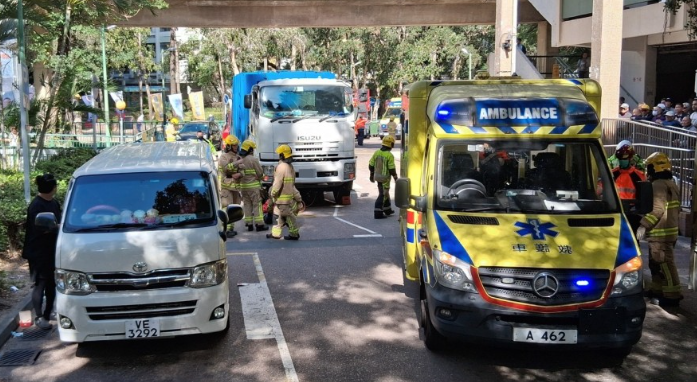 【點新聞報道】屯門今(25日)早發生交通意外。早上10時許,一輛垃圾車在屯門愛勇街2號友愛商場對開,撞倒一名坐輪椅的過路婦,並將她捲入車底受困。救援人員接報到場拯救,其後將婦人救出。她頭部流血、腳部骨折幸清醒,由救護車送往屯門醫院救治。警方在場調查車禍原因。
