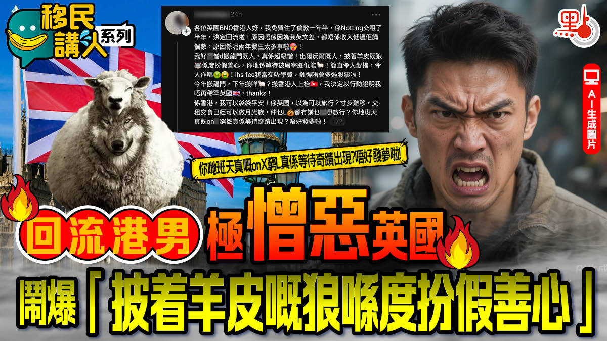 樓主鬧爆英國政府搬龍門,指留英的港人只有任由宰割的份,「我好撚憎d搬龍門嘅人,真係超級憎!出爾反爾嘅人,披着羊皮嘅狼喺度扮假善心,你哋係等待被屠宰嘅低能!簡直令人髮指,令人作嘔的!Ihs fee我當交學費,蝕得唔會多過股票咁數學網課補習老師」。