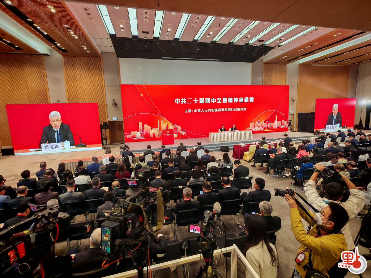 行政長官李家超,中央港澳工作辦公室副主任、國務院港澳事務辦公室副主任、中央政府駐港聯絡辦公室主任周霽分別在宣講會上致辭。侯建國、祝衛東分別作宣講,深入闡釋了中共二十屆四中全會精神,以及《中共中央關於制定國民經濟和社會發展第十五個五年規劃的建議》的主要內容和重大意義,兩位宣講團成員亦回應了與會者提出的問題。李家超作總結發言。
