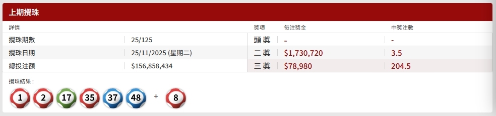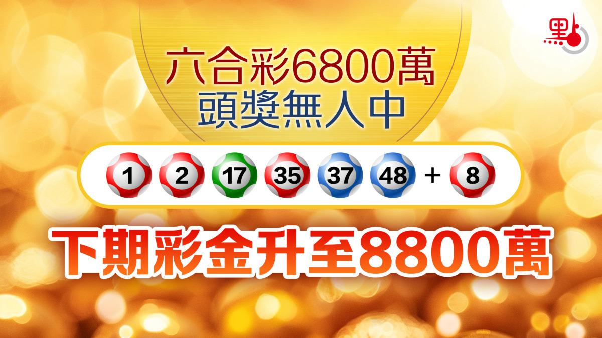 【點新聞報道】頭獎6800萬六合彩今晚(25日)攪珠,攪珠結果為1、2、17、35、37、48,特別號碼8。